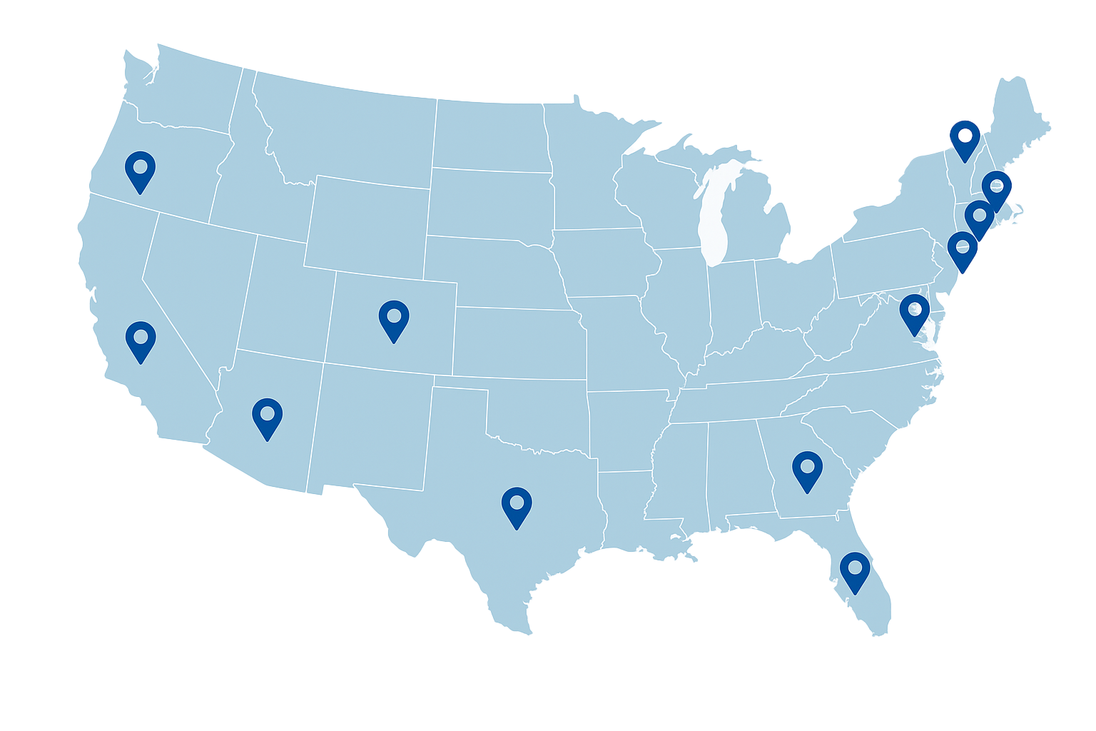 East Coast: MD, VA, DC, WV, NC, FL, NY, NJ, PA, DE, CT, NH, and MA West & Central Regions: CA, NV, TX, WA, HI, and CO